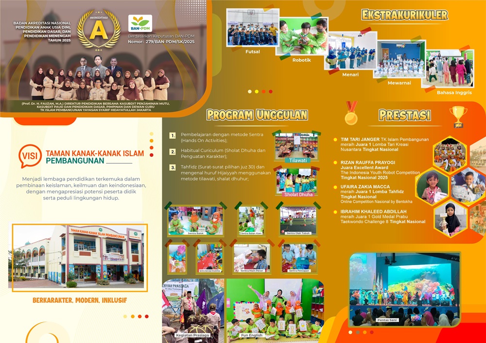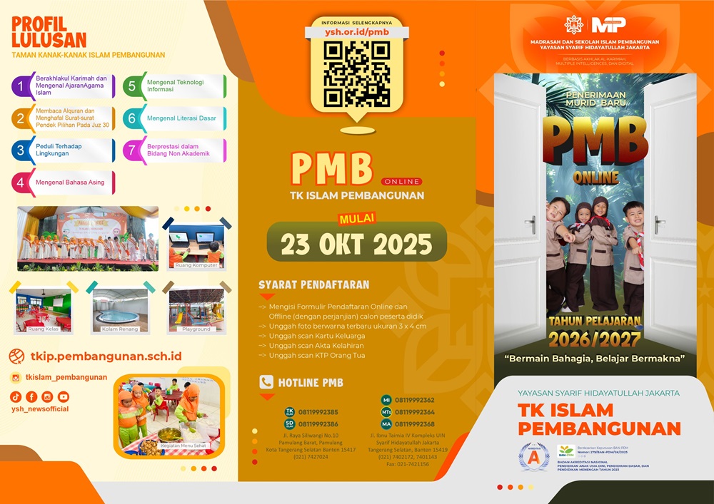 Pendaftaran TK Islam Pembangunan dibuka untuk tingkat TK A (3 Kelas) dan TK B (1 Kelas).